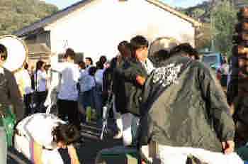 | 太鼓の積み込みも意外と時間かかるんですよね。 「ちょっと待って、どっか引っ掛かってっと」 |