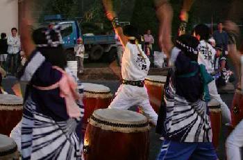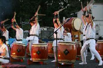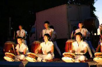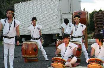 | 「縄文の炎と響」と題して「野焼祭」が小砂焼窯元の藤田製陶所で行われた。 野焼祭では、縄文めし、縄文猪鍋(ししなべ)などのほか、地元の小学生やママさんたちのゴスペルグループ「オリオリ」の演奏などもあり、秋晴れの下、大いに賑わいをみせた。 まほろば太鼓も野焼祭は初めての演奏だったが、陽が落ちるにつれ、野焼の炎と太鼓の響きがマッチしていい雰囲気を醸し出すことができた。また、演奏の最後には和太鼓体験も用意し、ちゃっかりとPRにも努めた。 |
