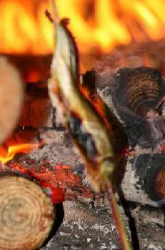 いただいた鮎が冷めてしまったので おそれ多くも縄文の炎で焼いております。 |