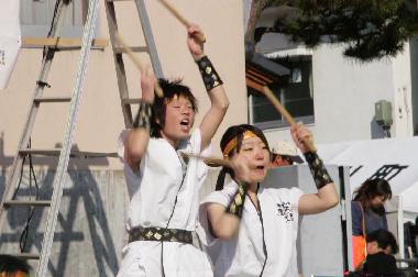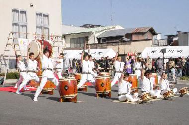 | 第4回目となる「広重紅葉まつり(ひろしげもみじまつり)」が那珂川町役場周辺を会場に行われた。広重紅葉まつりでは、広重お祭り広場、街角美術館、美術館周辺紅葉ライトアップ、ライトアップコンサートなど多彩な催しが繰り広げられ、まほろば太鼓もお祭り広場のアトラクションに出演した。 前日の公演に続き二日連続だったが、お天気にも会場のお客さんにも恵まれ気持ちよく太鼓を打ちことができた。 |
