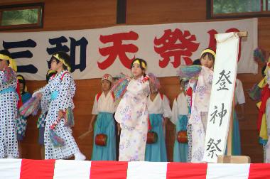 〔三和天祭り〕![]() 揃いの浴衣姿で さっそうと踊りを披露しています。 |