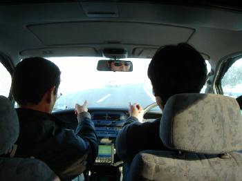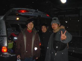 小雪降る中の出発(午前1:00) 東北道通行止という前途多難な状況にもかかわらず 異常なまでに明るい三人!? |