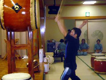 成果発表オオトリは打込み専門講座 締太鼓12人によるソロ回しは見ものでした?! 写真は筆者のアドリブソロの勇姿!? (実はこの前にバチを落っことしているのです・・・) |
