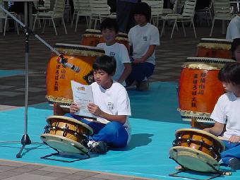 | 毎年開かれている「マロニエっ子フェスティバル2003」が、今年はお隣り湯津上村の栃木県立なかがわ水遊園で開かれ、小川町を代表してまほろば子ども太鼓が出演した。 県北地区のほかの子どもたちもたくさん出場する中、「まほろば子ども太鼓」は、「翔け未来へ」と「まほろばの風」の2曲を演奏し、たくさんの拍手をいただいた。 筆者は、残念ながら仕事の関係で子どもたちの勇姿を見ることができなかった。 |