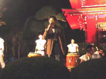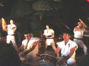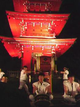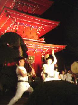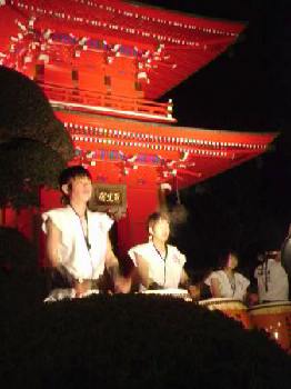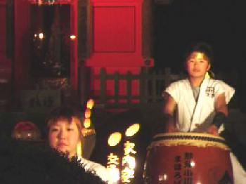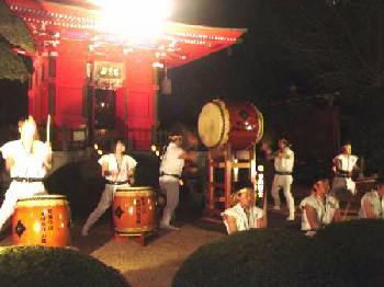 | 2006年1月1日零時半、那珂川町白久の「長泉寺」にて除夜の鐘とともに「撥の響演」を繰り広げた。 後で知ったが、気温は零下6℃だったそうで、手足の先がちぎれそうだった。 あまりの寒さのせいか(酔いのせい?)私のMCが流暢さにかけていたのは事実であった。 でも、けっこう楽しかったとの声が大半! 来年もお声がかかればやっちゃうぞ〜! ね、みんな?! |