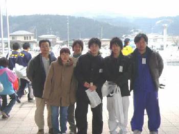 | 今年参加の総勢6人 多分、今年から会場となった男鹿市体育館の前でしょう。 |