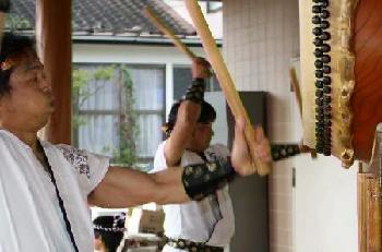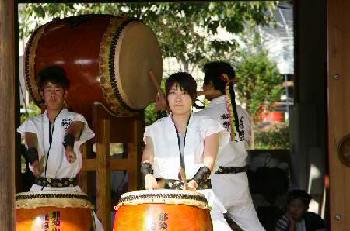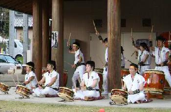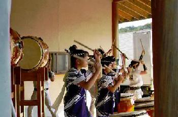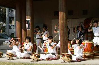 | 11月4日と5日の2日間、小砂焼窯元の藤田製陶所で小砂焼陶器市 秋の登り窯まつりが行われた。 前回の野焼祭につづいてまほろば太鼓に演奏依頼があり、快くお引き受けしての演奏会だった。 今回の演奏場所は、藤田製陶所内の「陶遊館」という建物のエントランスホールで、円の4分の1の形をしたちょっと変わった場所だった。実は、万一の雨のために用意されていた場所だったが、下見の時に「趣きがある」と即決した場所だったのだ。 わたくし管理人の現役復帰も兼ねた演奏会は、晴天にも恵まれ、会場をも巻き込んで盛大な拍手の中で幕を閉じた。 |