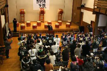 保存会事業の一つである打ち初め式が今年も行われた。まほろば太鼓はおかげ様で10年を過ぎたが、保存会は2年半遅れて設立されたこともあって、打ち初め式は8回を数えることになった。今年の打ち初め式にも町長、議長、助役、収入役、馬頭祝太鼓代表をはじめ一般の方々もお迎えして行われ、セレモニー(あいさつ、誓いのことば、甘酒で乾杯など)のあと、9曲をご披露した。