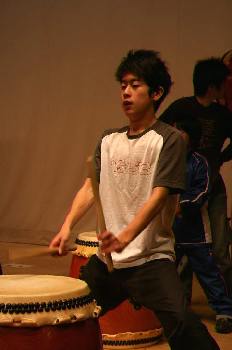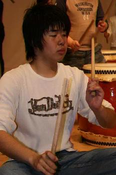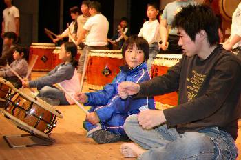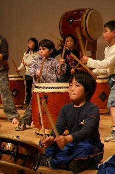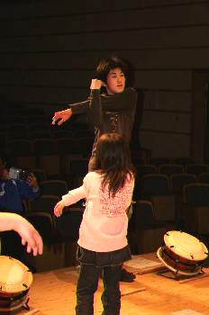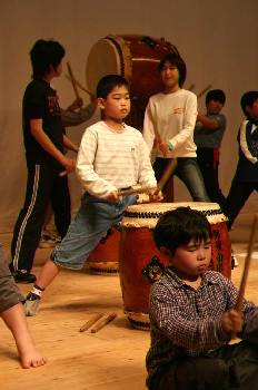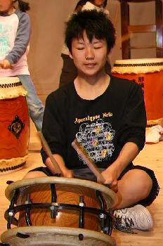 指導がすっかり板についた雅彰(まさあき) この春から専門学生となった彼は 宇都宮在住となり、火曜日の子ども太鼓指導は おろそかになりそうです。残念! |