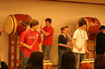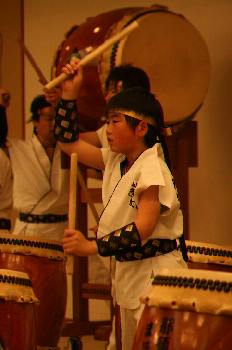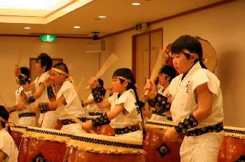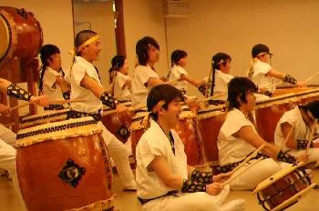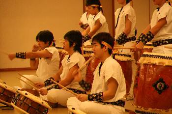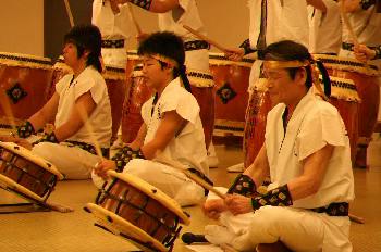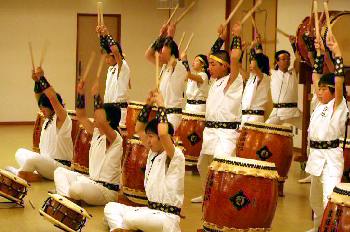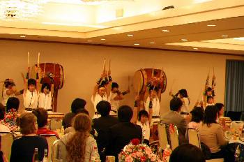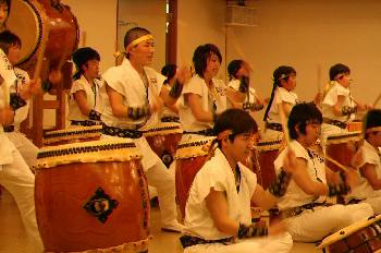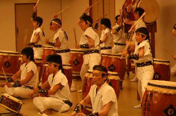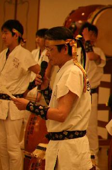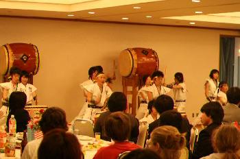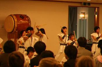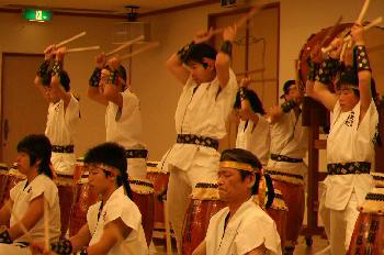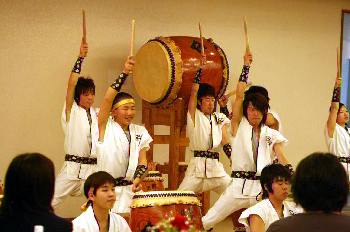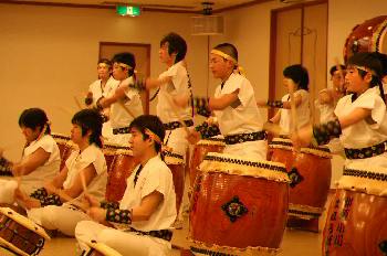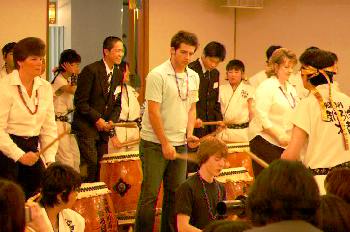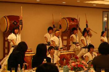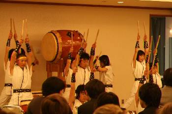 | 2007年(平成19年)4月11日(水曜日)、那珂川町(旧馬頭町)と姉妹都市を提携しているアメリカ合衆国ホースヘッズ村親善訪問団のさよならパーティーが那珂川町馬頭のグリーンパル(農協会館)で開かれ、アトラクション演奏を今年も行った。 昨年は私の下手な英語のため、ハプニングで和太鼓体験を行なったが、それ(下手な英語ではなく和太鼓体験)が結構評判がよかったらしく、「ぜひ今年もやってくれ」との要望を受けて、今年は鉄筒を持ち込み準備万端の和太鼓体験となった。 肝心の演奏のほうは、Joyful Beat 〜祭音〜、古羅母//04、SESSION2002のほか、今年の秋田県和太鼓講習会の「体育会系打込み講座成果発表曲」改メ「和太鼓E長調」も演奏した。和太鼓E長調は「メリハリがあって素晴らしい」との評価をうけ大好評だった。 |