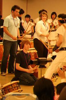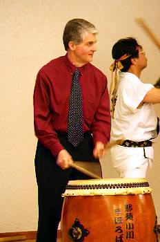 〔和太鼓体験コーナー〕 訪問団長のデュボアさんです。 |