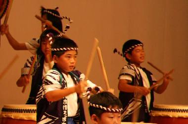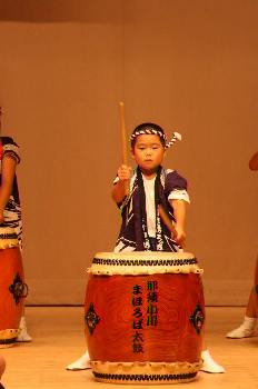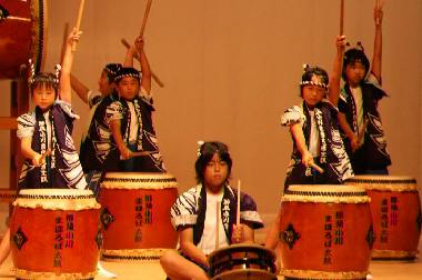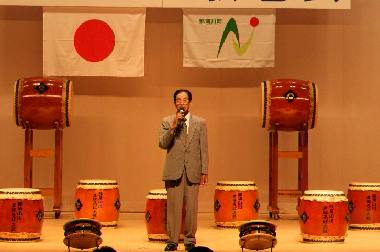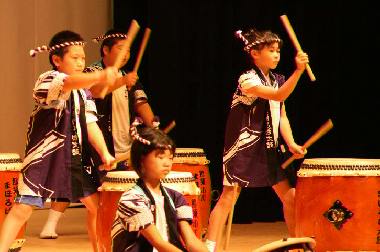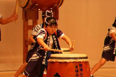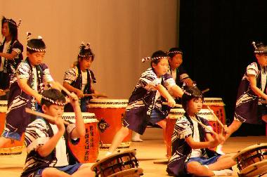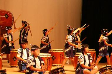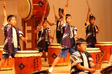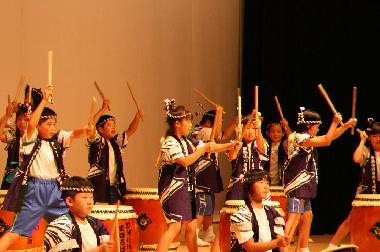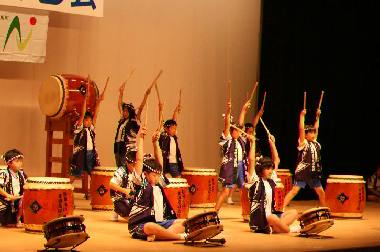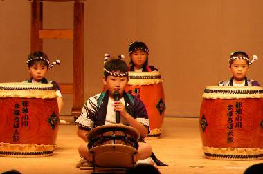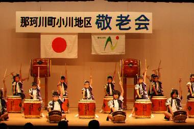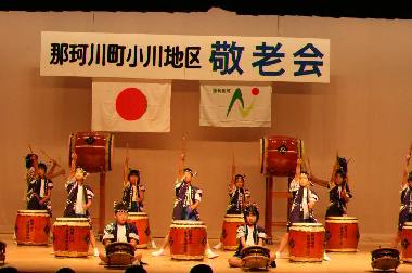 那珂川町小川地区敬老会が那珂川町小川総合福祉センター「あじさいホール」で開かれた。第1部のセレモニーのあと、第2部として、保育園児による「よさこいソーラン」、まほろばおがわほほえみクラブによる「ハワイアンダンス」、まほろばがたり会員による「まほろばがたり」のアトラクションが行われ、「まほろば子供太鼓」もオオトリで出演し、「翔け未来へ」、「第二部 国造」、「まほろばの風」の3曲を熱演した。