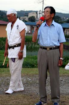 〔あいさつ〕![]() あいさつ中の増子保存会長 となりは磯会主 (会主とは打ち手の親方のことです。) |