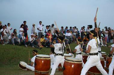 〔SESSION2002〕![]() お客さんは土手(堤防)の上から観戦です。 ※観戦⇒そう、太鼓演奏は戦いです! |