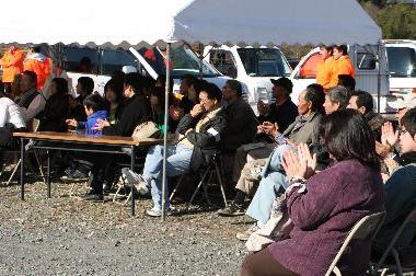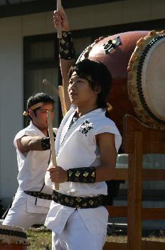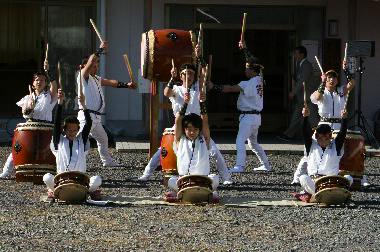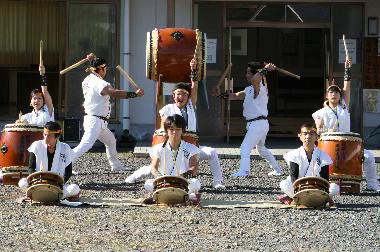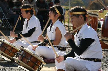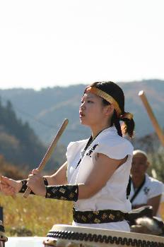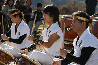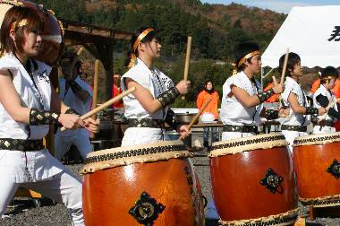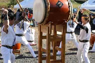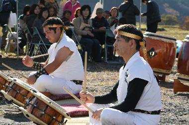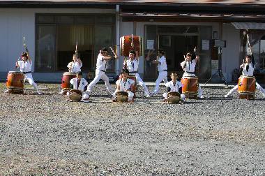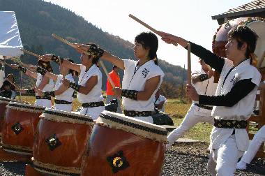 地元の方々やスタッフによる、とん汁や手打ちそば、鮎の塩焼きなどのおもてなしの前に、まほろば太鼓の歓迎演奏が行われ、たくさんのご声援をいただいた。