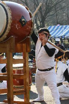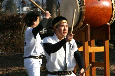 | 小川商工会主催の「暮れ市」に、昨年につづいて招かれ、アトラクション演奏を行った。 昨年の寒さを覚えている我々は、インナーシャツを着込んで演奏に臨んだが、お天気に恵まれ、と言うか恵まれ過ぎて、じっとりと汗を掻いてしまった。 何はともあれ、今回も「JAまつり」に続いて『気魂』をメインに全5曲を打ち終えた。 |