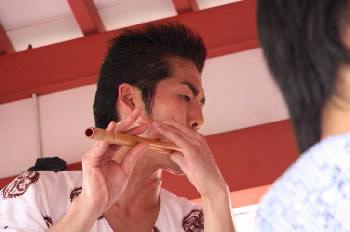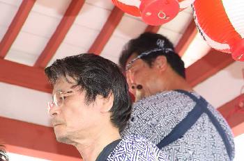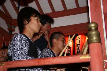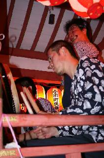 和泉地囃子保存会長の大胴に乗って 中付けを叩く辰則 |