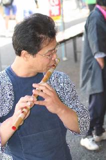 〔H.Homboh理事〕 Waizumi師匠(本日欠席)の二番弟子です。 実はこの人の笛が一番鳴ります。 ちなみに一番弟子は筆者です。 |