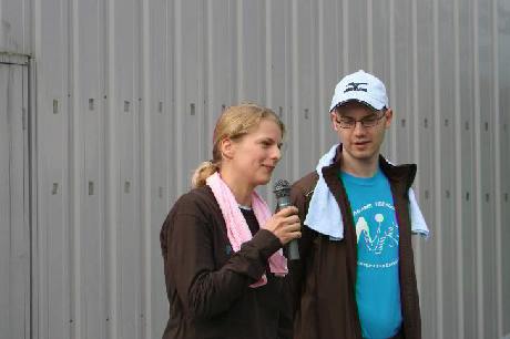 | 開会式では外国人の自己紹介が行われました。 写真は前の那珂川町国際交流員だったアンディーの奥さんのスピーチです。 Foreign guest participants introduced themselves at the opening ceremony. Former Nakagawa Town CIR Andy and his wife are photographed during their speech. |