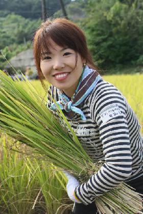 | 稲刈り開始! レクチャーどおり上手い具合に束ねられて満面の笑みです。 The harvest begins! A confident smile after skillfully bundling the rice just as she learned in the lecture. |