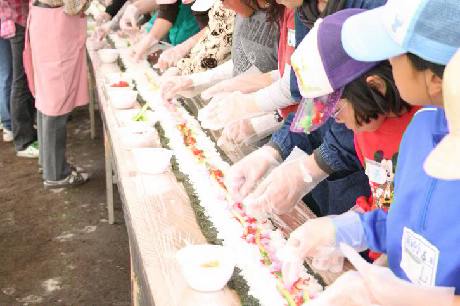 | 長ーい「海苔巻きづくり」に挑戦です。 Trying our hands making a looooong norimaki seaweed and rice roll. |