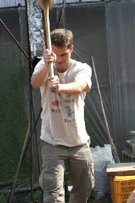 | サムライのような上段の構えは「餅つき」に挑戦中のスコットです。 Here’s Scott, striking up a samurai pose as he takes on the challenge to pound the sticky rice into mochi rice cakes. |