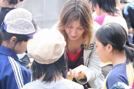 | 界冒険者カードに書き込んで貰う子どもたち! 何国かの外国人のサインを集めるとプレゼントが貰えます。 Children get signatures on their World Adventurer Cards! The children received prizes for collecting the foreign guests signatures. |