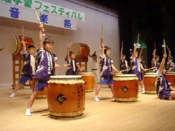 | 平成17年10月29日、平成17年度生涯学習フェスティバル「音楽祭」が開かれ、ジュニアチームの「まほろば子供太鼓」が出演した。 「翔け未来へ」と「まほろばの風」の2曲を演奏したが、特に2曲目の「まほろばの風」は、ほとんどの子どもたちにとっては新曲であり、3週間位の超特急でおぼえてのお披露目となった。 練習不足のわりには、なんとか無難にこなし、しっかりとオオトリを務めることができた。 |