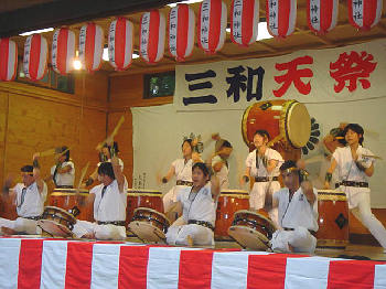 | 毎年行われている小川町の郷土芸能で五穀豊穣を願う「三和天祭り」に招かれ出演した。 あいにくの小雨の中、また、狭い舞台のため少数精鋭となったが、我々の熱演にたくさんの拍手をいただいた。 関係者のみなさん、そしてご来場のみなさんありがとうございました。 |